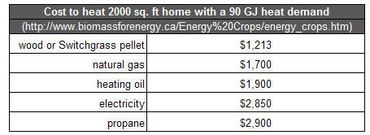 The first chart below shows cost estimates comparing the cost to heat a 2000 sq ft a home with various fuel sources (data gathered 2009 - 2010). The second chart outlines the carbon output for various fuel sources. Notice that burning hay results in nearly the least amount of carbon emissions per million BTU (data gathered 2009 - 2010 and validated September 2011):